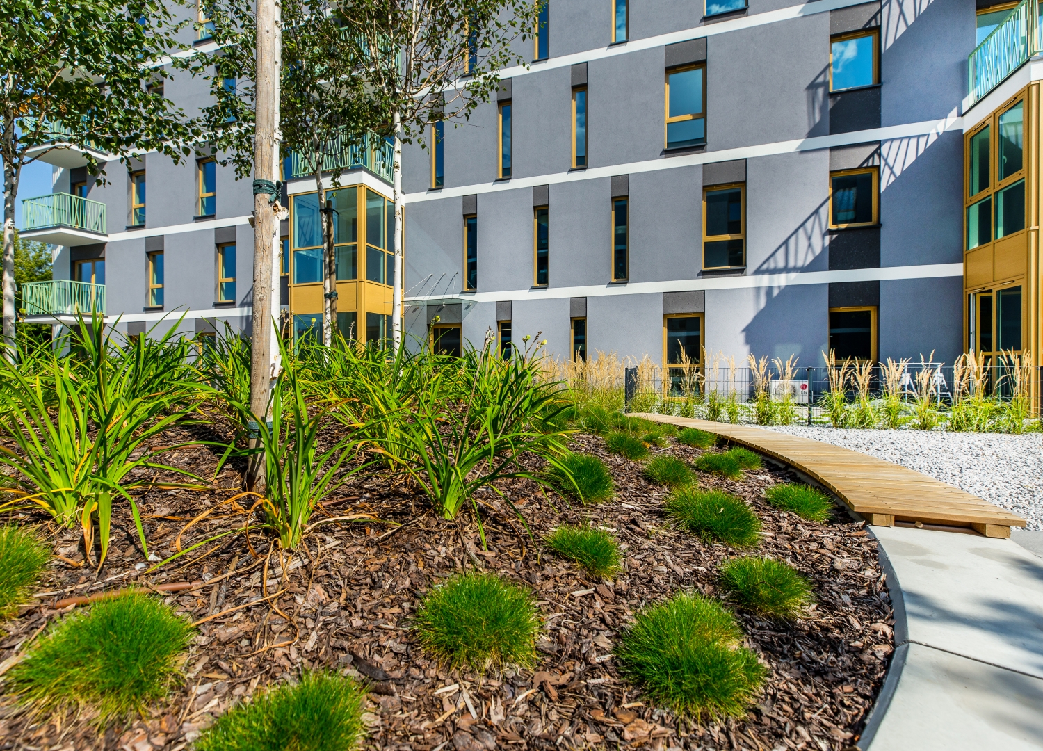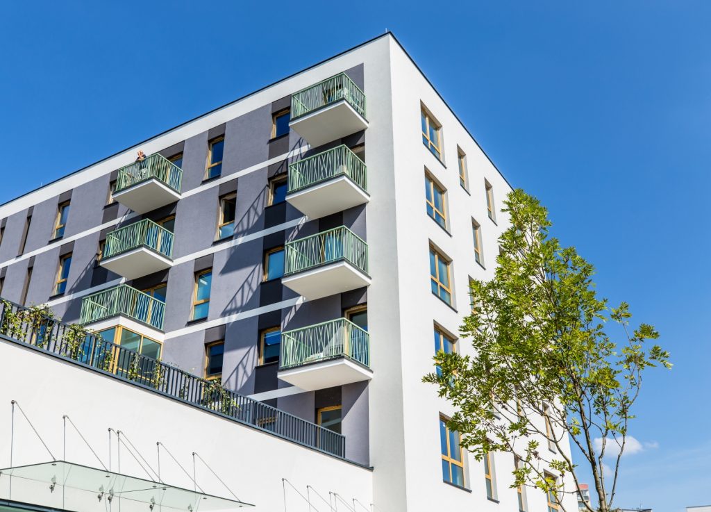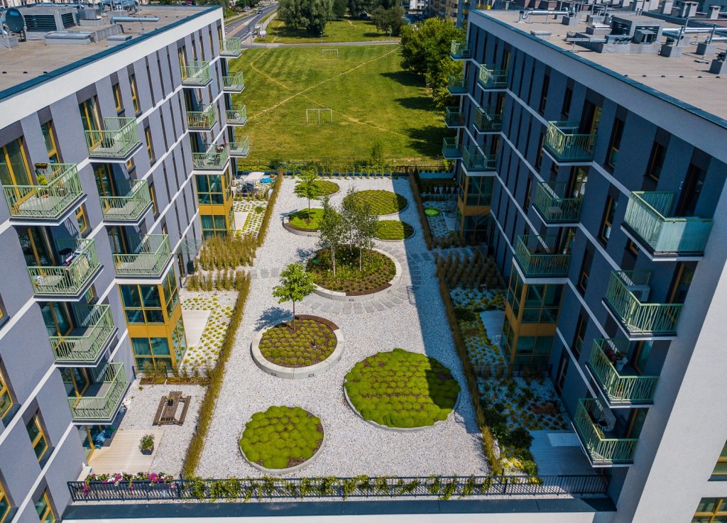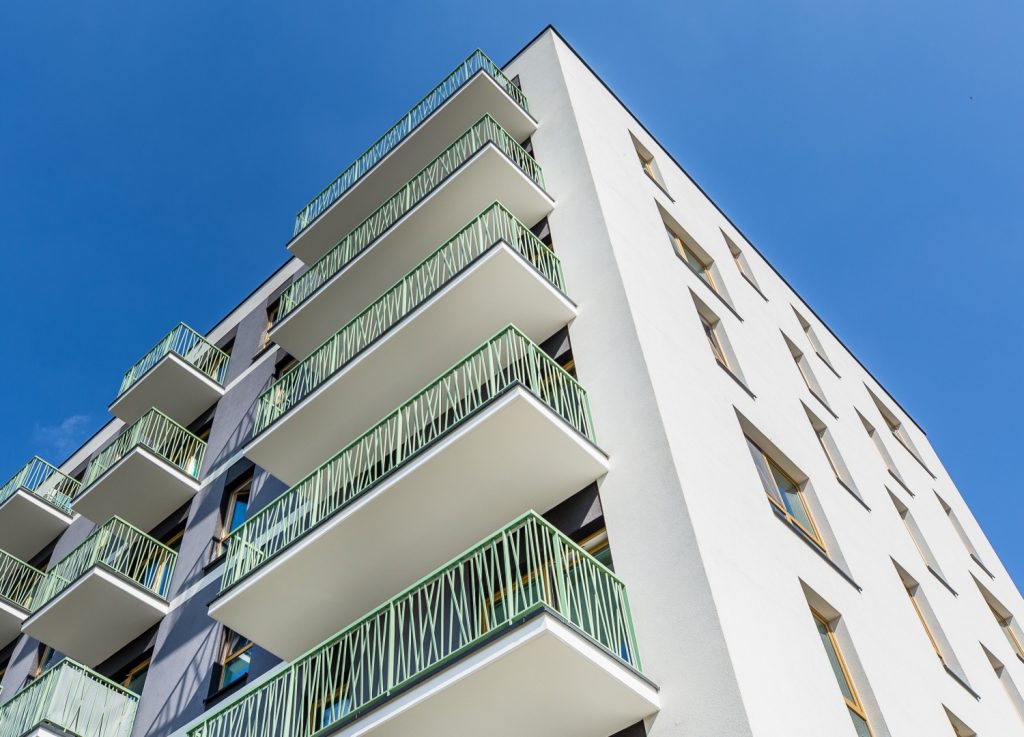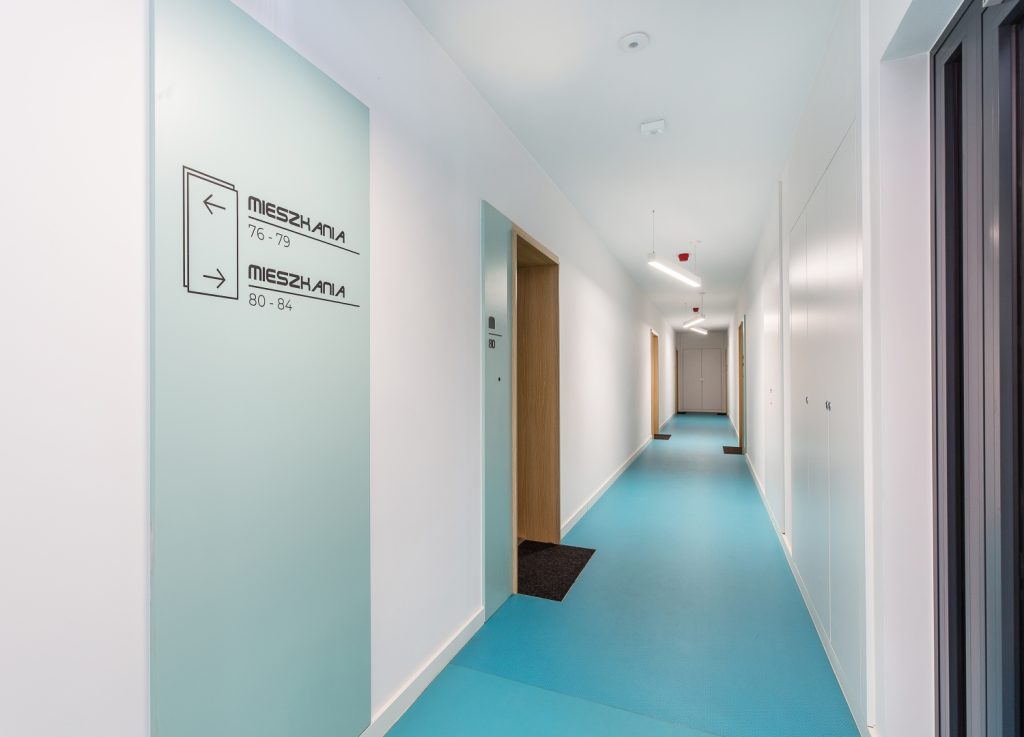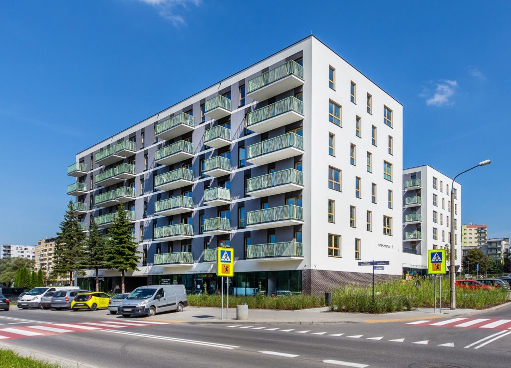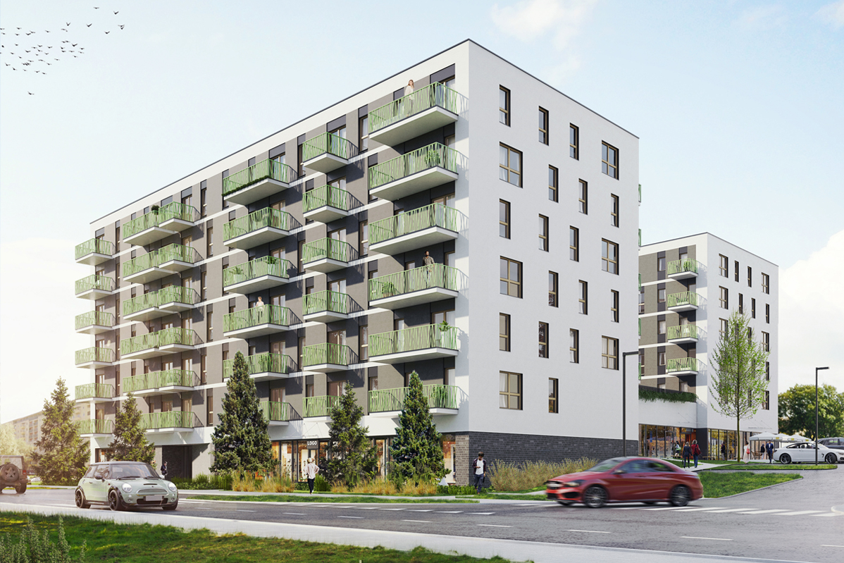Wyjątkowy charakter osiedla DOMOSFERA podkreśla nowoczesny design budynków. Elewacja z nietuzinkowymi zielonymi balustradami oraz oryginalnie wykończone części wspólne tworzą przyjazną i estetyczną przestrzeń do życia. Dbałość o detale widoczna jest na każdym kroku, co wyróżnia tę inwestycję na tle innych ofert mieszkań w okolicy.